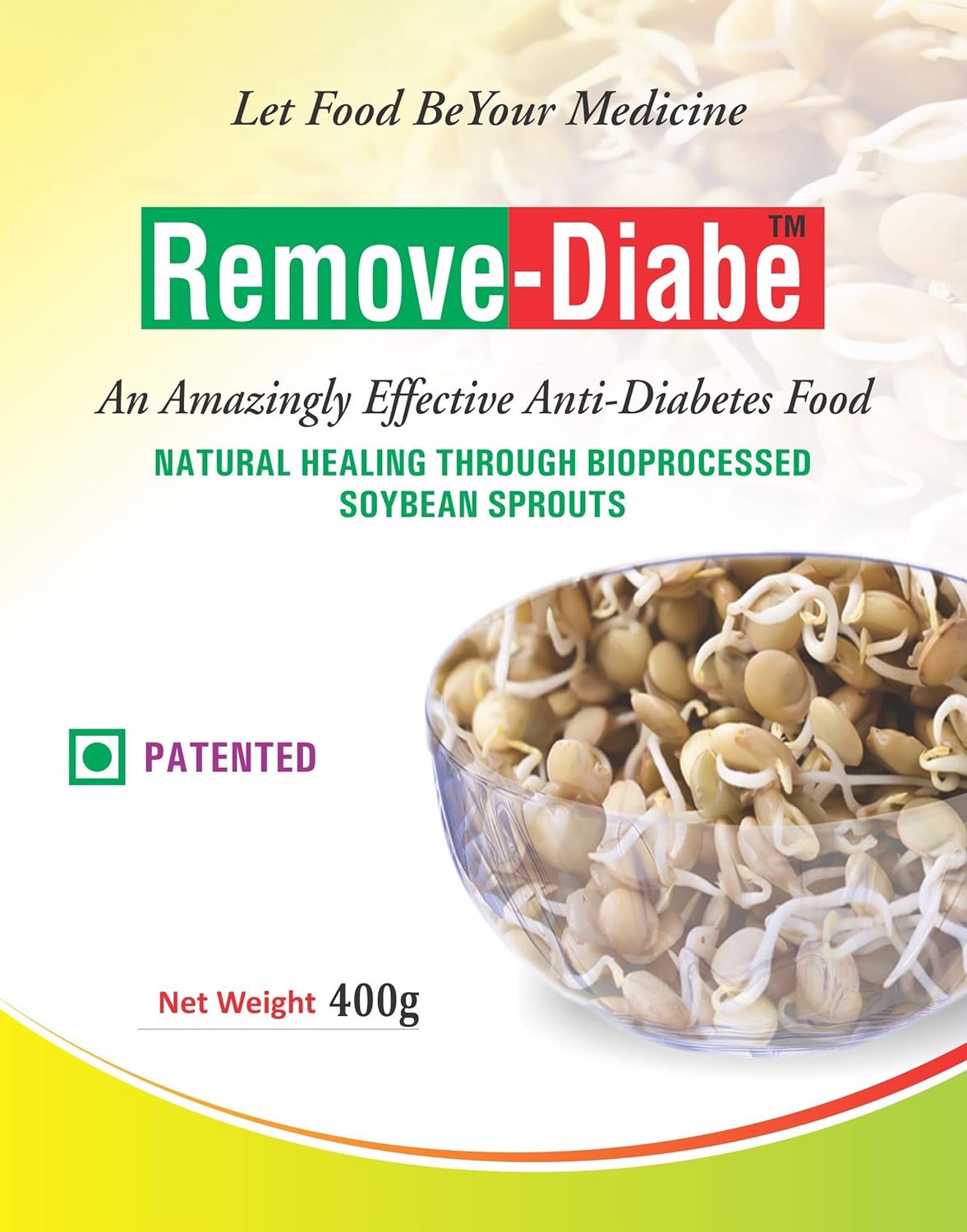 Remove-Diabe is a patented superfood that acts on human cells to manage high blood sugar. Made from bioprocessed and optimally germinated Soybean seeds, Remove-Diabe contains all desired bioactive ingredients including Insulin-like proteins. It contains all essential amino acids to give you a complete high-quality protein source. It also contains inositols, vitamins of B and C group, prebiotics and probiotics, high calcium, folate, iron, copper, manganese, zinc, riboflavin, niacin, ascorbic acid, phosphate, and overall low calorie to minimize the complications of high blood sugar. The process of optimal germination and bioprocessing turns the Soybean seeds into an amazing blood sugar regulator - this is invented by Dr. Manju Pathak, an Indian scientist who received three granted Indian patents for this invention.